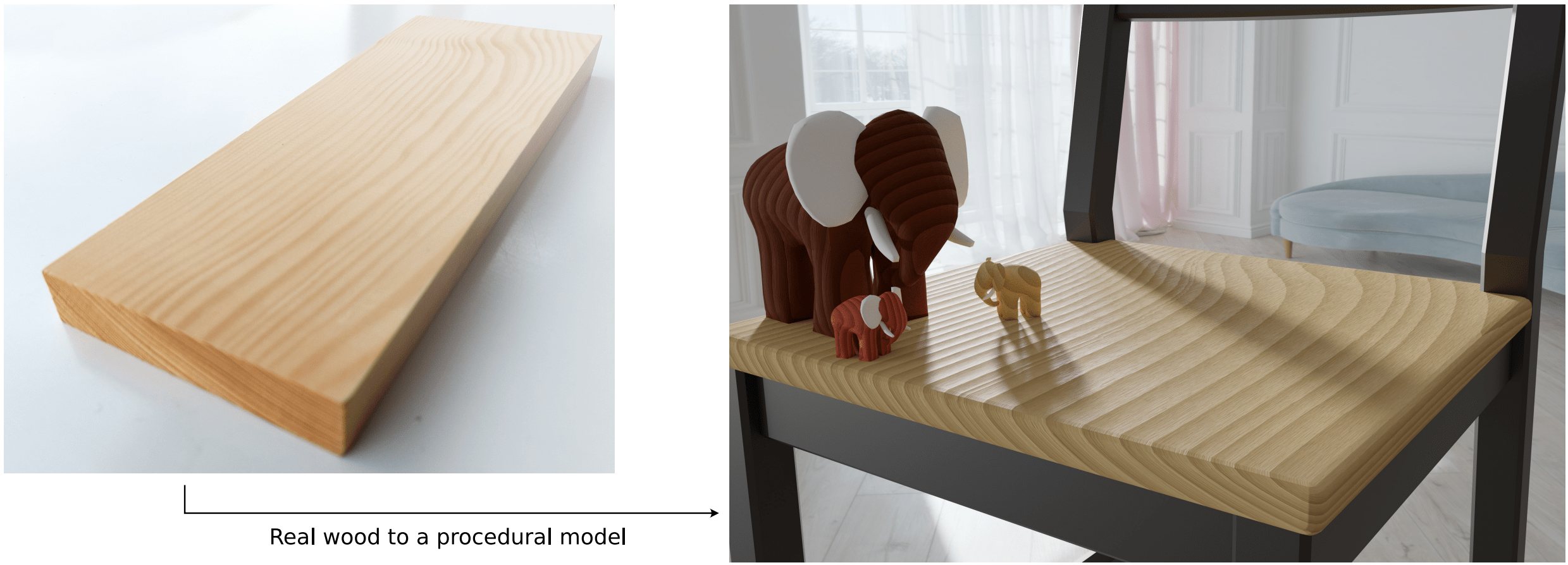 Wood is a volumetric material with a very large appearance gamut that is further enlarged by numerous finishing techniques. Computer graphics has made considerable progress in creating sophisticated and flexible appearance models that allow convincing renderings of wooden materials. However, these do not yet allow fully automatic appearance matching to a concrete exemplar piece of wood, and have to be fine-tuned by hand. More general appearance matching strategies are incapable of reconstructing anatomically meaningful volumetric information. This is essential for applications where the internal structure of wood is significant, such as non-planar furniture parts machined from a solid block of wood, translucent appearance of thin wooden layers, or in the field of dendrochronology. In this paper, we provide the two key ingredients for automatic matching of a procedural wood appearance model to exemplar photographs: a good initialization, built on detecting and modelling the ring structure, and a phase-based loss function that allows to accurately recover growth ring deformations and gives anatomically meaningful results. Our ring-detection technique is based on curved Gabor filters, and robustly works for a considerable range of wood types.