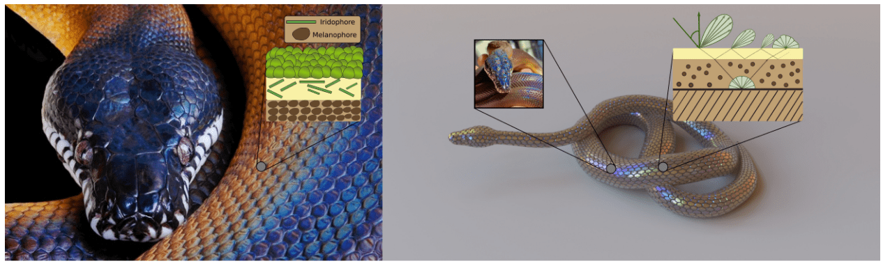 : Simulating the light transport on biological tissues is a longstanding challenge, given its complex multilayered structure. In biology, one of the most remarkable and studied examples of tissues are the scales that cover the skin of reptiles, which present a combination of photonic structures and pigmentation. This is, however, a somewhat ignored problem in computer graphics. In this work, we propose a multilayered appearance model based on the anatomy of the snake skin. Some snakes are known for their striking, highly iridescent scales resulting from light interference. We model snake skin as a two-layered reflectance function: The top layer is a thin layer resulting on a specular iridescent reflection, while the bottom layer is a diffuse highlyabsorbing layer, that results into a dark diffuse appearance that maximizes the iridescent color of the skin. We demonstrate our layered material on a wide range of appearances, and show that our model is able to qualitatively match the appearance of snake skin.