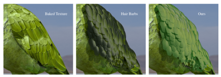 : The appearance of a real-world feather results from the complex interaction of light with its multi-scale biological structure, including the central shaft, branching barbs, and interlocking barbules on those barbs. In this work, we propose a practical surface-based appearance model for feathers. We represent the far-field appearance of feathers using a BSDF that implicitly represents the light scattering from the main biological structures of a feather, such as the shaft, barb and barbules. Our model accounts for the particular characteristics of feather barbs such as the non-cylindrical cross-sections and the scattering media via a numerically-based BCSDF. To model the relative visibility between barbs and barbules, we derive a masking term for the differential projected areas of the different components of the feather’s microgeometry, which allows us to analytically compute the masking between barbs and barbules. As opposed to previous works, our model uses a lightweight representation of the geometry based on a 2D texture, and does not require explicitly representing the barbs as curves. We show the flexibility and potential of our appearance model approach to represent the most important visual features of several pennaceous feathers.