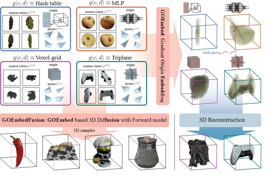 : Encoding information from 2D views of an object into a 3D representation is crucial for generalized 3D feature extraction. Such features can then enable 3D reconstruction, 3D generation, and other applications. We propose GOEmbed (Gradient Origin Embeddings) that encodes input 2D images into any 3D representation, without requiring a pre-trained image feature extractor; unlike typical prior approaches in which input images are either encoded using 2D features extracted from large pre-trained models, or customized features are designed to handle different 3D representations; or worse, encoders may not yet be available for specialized 3D neural representations such as MLPs and hash-grids. We extensively evaluate our proposed GOEmbed under different experimental settings on the OmniObject3D benchmark. First, we evaluate how well the mechanism compares against prior encoding mechanisms on multiple 3D representations using an illustrative experiment called Plenoptic-Encoding. Second, the efficacy of the GOEmbed mechanism is further demonstrated by achieving a new SOTA FID of 22.12 on the OmniObject3D generation task using a combination of GOEmbed and DFM (Diffusion with Forward Models), which we call GOEmbedFusion. Finally, we evaluate how the GOEmbed mechanism bolsters sparse-view 3D reconstruction pipelines.