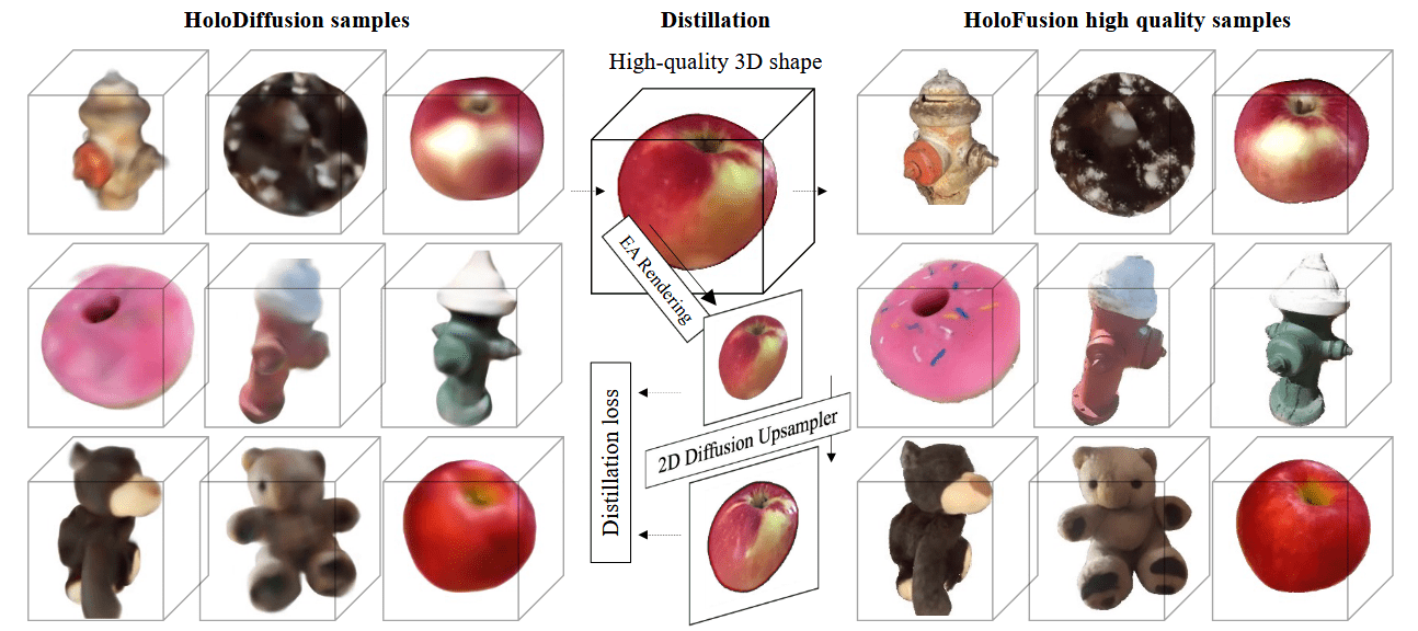 : Diffusion-based image generators can now produce high-quality and diverse samples, but their success has yet to fully translate to 3D generation: existing diffusion methods can either generate low-resolution but 3D consistent outputs, or detailed 2D views of 3D objects but with potential structural defects and lacking view consistency or realism. We present HoloFusion, a method that combines the best of these approaches to produce high-fidelity, plausible, and diverse 3D samples while learning from a collection of multi-view 2D images only. The method first generates coarse 3D samples using a variant of the recently proposed HoloDiffusion generator. Then, it independently renders and upsamples a large number of views of the coarse 3D model, super-resolves them to add detail, and distills those into a single, high-fidelity implicit 3D representation, which also ensures view-consistency of the final renders. The super-resolution network is trained as an integral part of HoloFusion, end-to-end, and the final distillation uses a new sampling scheme to capture the space of super-resolved signals. We compare our method against existing baselines, including DreamFusion, Get3D, EG3D, and HoloDiffusion, and achieve, to the best of our knowledge, the most realistic results on the challenging CO3Dv2 dataset.