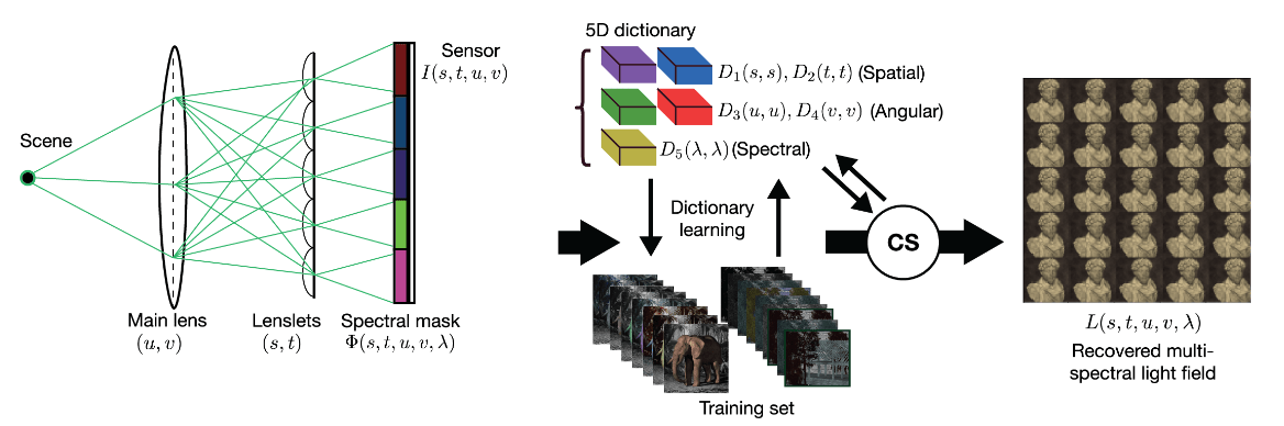 : This paper considers a compressive multi-spectral light field camera model that utilizes a one-hot spectral-coded mask and a microlens array to capture spatial, angular, and spectral information using a single monochrome sensor. We propose a model that employs compressed sensing techniques to reconstruct the complete multi-spectral light field from undersampled measurements. Unlike previous work where a light field is vectorized to a 1D signal, our method employs a 5D basis and a novel 5D measurement model, hence, matching the intrinsic dimensionality of multispectral light fields. We mathematically and empirically show the equivalence of 5D and 1D sensing models, and most importantly that the 5D framework achieves orders of magnitude faster reconstruction while requiring a small fraction of the memory. Moreover, our new multidimensional sensing model opens new research directions for designing efficient visual data acquisition algorithms and hardware.