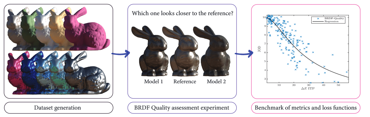 : Material appearance is commonly modeled with the Bidirectional Reflectance Distribution Functions (BRDFs), which need to trade accuracy for complexity and storage cost. To investigate the current practices of BRDF modeling, we collect the first high dynamic range stereoscopic video dataset that captures the perceived quality degradation with respect to a number of parametric and non-parametric BRDF models. Our dataset shows that the current loss functions used to fit BRDF models, such as mean-squared error of logarithmic reflectance values, correlate poorly with the perceived quality of materials in rendered videos. We further show that quality metrics that compare rendered material samples give a significantly higher correlation with subjective quality judgments, and a simple Euclidean distance in the ITP color space (ΔEITP) shows the highest correlation. Additionally, we investigate the use of different BRDF-space metrics as loss functions for fitting BRDF models and find that logarithmic mapping is the most effective approach for BRDF-space loss functions.